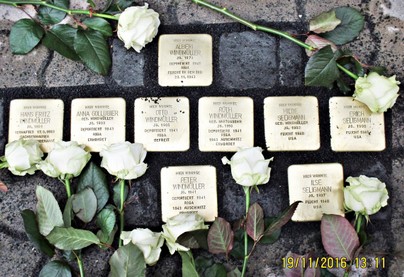 Am 19. November 2016 war es soweit. Die "Zweite Stolpersteinverlegung in Porta Westfalica" fand in der Hauptstraße 80 in Porta Westfalica-Hausberge statt. Insgesamt wurden vom Künstler Gunter Demnig neun Steine verlegt - im Beisein vieler Bürger*innen der Stadt Porta Westfalica und Umgebung. Drei Steine wurden von unserer Schul-AG "Jüdischer Friedhof Hausberge" kostenmäßig übernommen und für dieses Gedenken gesponsert. Vor dieser Verlegung in Erinnerung an die deportierte jüdische Hausberger Familie Windmüller fand eine kleine Feierstunde im Bürgerhaus Hausberge statt. Auch hier waren drei Schüler der AG an der Gestaltung wesentlich beteiligt. Kiara, Gunnar und Pascal lasen im Wechsel aus den Erinnerungen von Otto Windmüller vor, die dieser am 19. März 1952 auf dem Geschäftspapier seiner ESSO-Tankstelle niedergeschrieben hatte. Diese Erinnerungen von Otto Windmüller hat unserer AG vom Orsheimatpfleger Albert Münstermann erhalten. Im Vortrag der Schüler war eine Präsentation ausgewählter Texte und Fotos über Otto Windmüller eingebettet, in der auch insgesamt Informationen über den Ablauf der Deportationen der Juden und die Zustände im Ghetto Riga von der Schul-AG geschildert wurden. Die Aufzeichnungen waren erschütternd. Der Text der Schüler ist >>HIER<< aufgeführt.